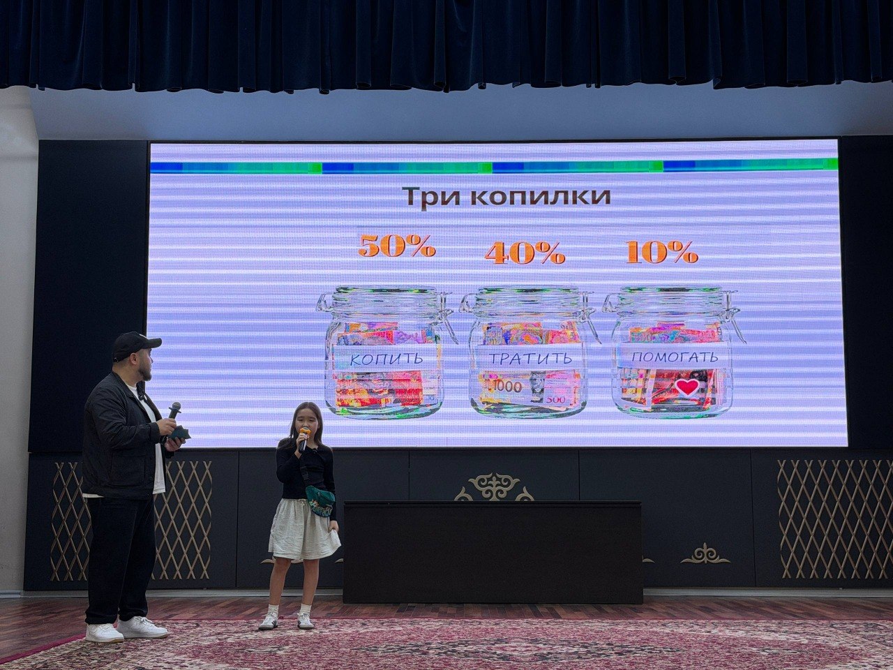 Ал эми MJunior амбассадорлору Азим Азимов кызы менен сахнага чыгып, жөнөкөй үй-бүлөдө да финансы маданияты болушу керек экенин көрсөттү.