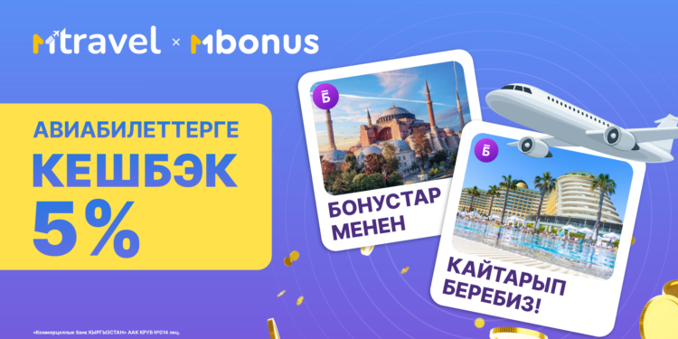 2024-жылдын октябрынан тартып MTravel кызматы MBANK тиркемесинде пайдалуу акцияны ишке киргизип жатат: ар бир авиабилет сатып алууда 5% кэшбэк. Бул учуудан ырахат алуу үчүн гана эмес, кийинки сапарыңыз үчүн үнөмдөөгө да сонун мүмкүнчүлүк.
