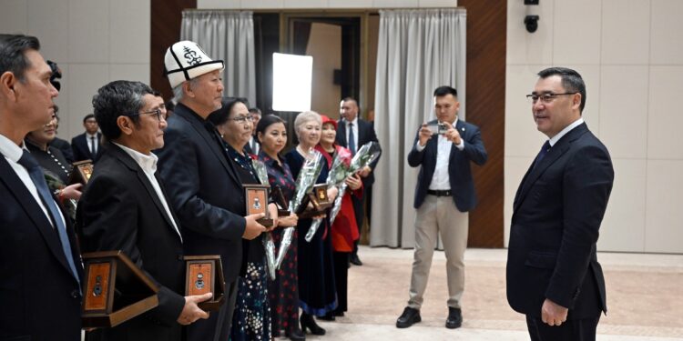 Президент Садыр Жапаров бүгүн, 2-ноябрда республиканын маданий, интеллектуалдык жана руханий потенциалын өнүктүрүүгө салым кошкон, көп жылдык үзүрлүү эмгеги үчүн, ошондой эле Кыргыз Республикасынын Маданият кызматкерлеринин күнүн майрамдоого байланыштуу маданият ишмерлерине мамлекеттик сыйлыктарды тапшырды.