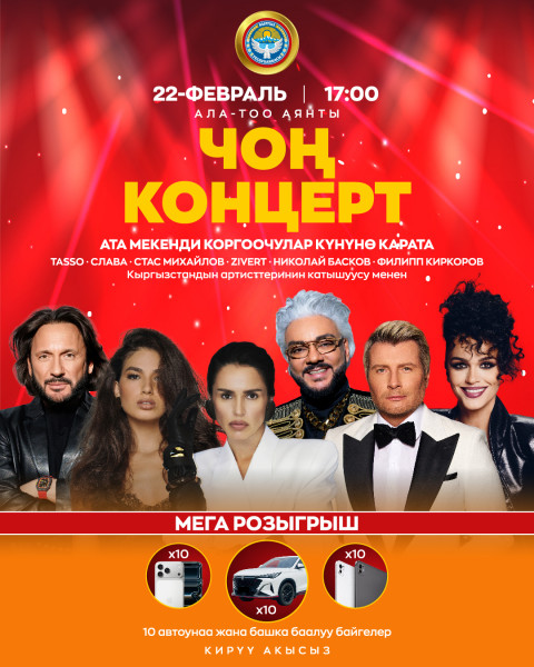 Урматтуу борбор калаанын тургундары жана коноктору! Бишкек шаарынын мэриясы сиздерди Ата Мекенди коргоочулардын күнүнө арналган майрамдык концертке чакырат!