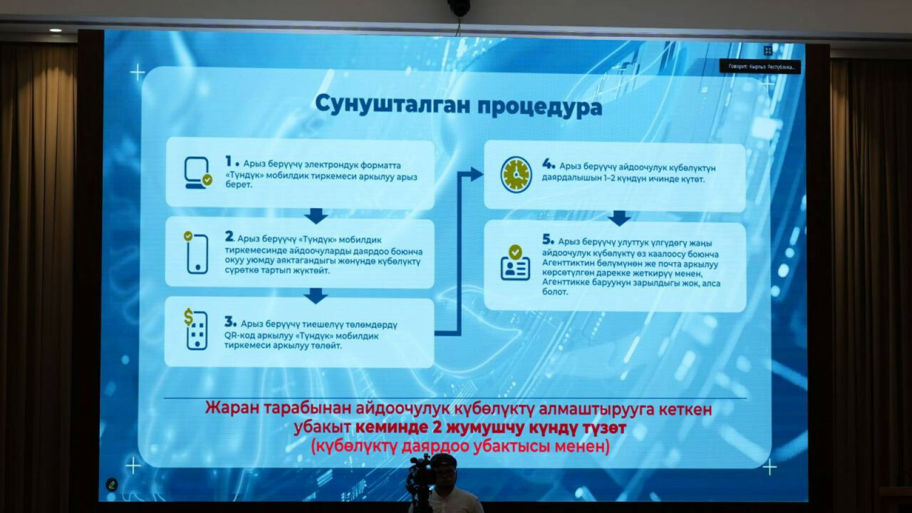 «Биз ар бир айдоочуну түйшөлткөн көйгөй болгон айдоочулук күбөлүктү алмаштырууда ашыкча бюрократиялык тоскоолдуктарды чечүүнү көздөп жатабыз. Бул көйгөйгө дээрлик ар бир жаран туш болуп, ал күнүмдүк жашоого таасирин тийгизет», — деди Адылбек Касымалиев.