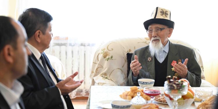 Акылбек Жапаров Улуу Ата Мекендик согуштун ардагери Аспек Жумашевге 100 миң сом тапшырды