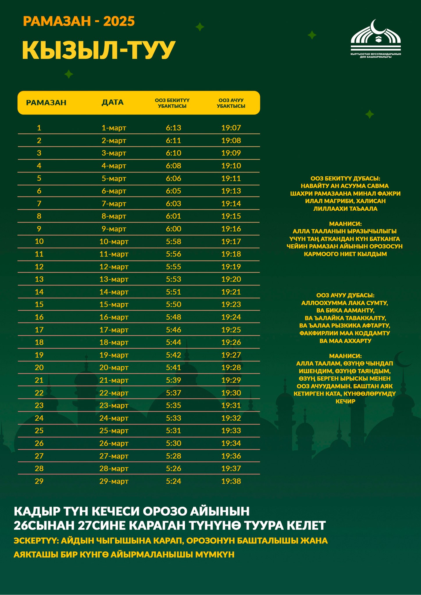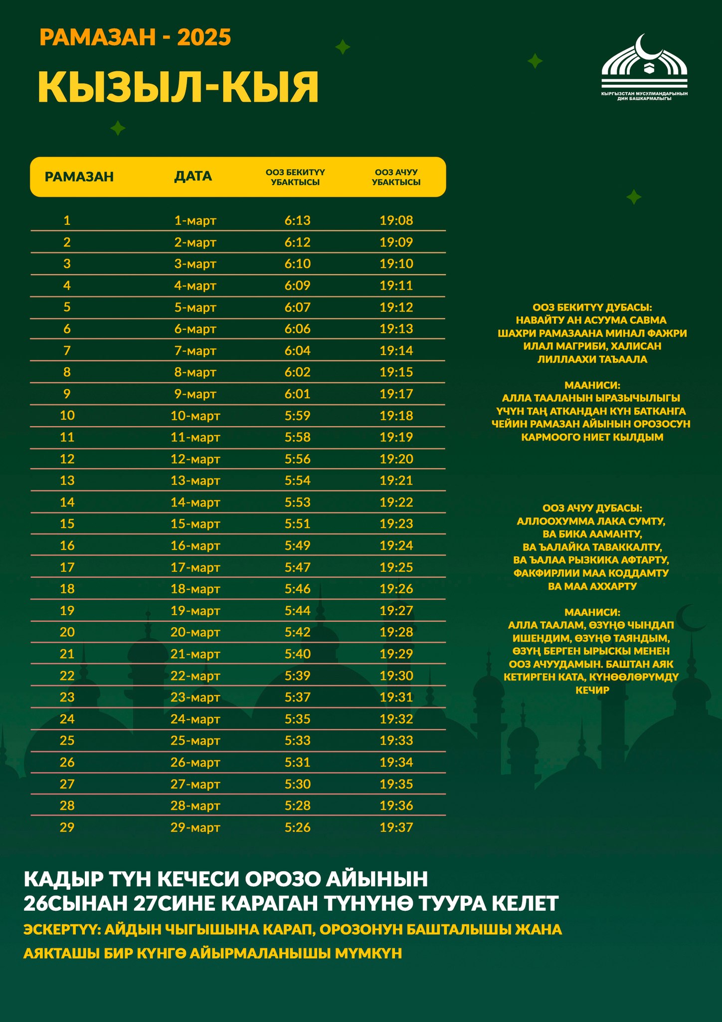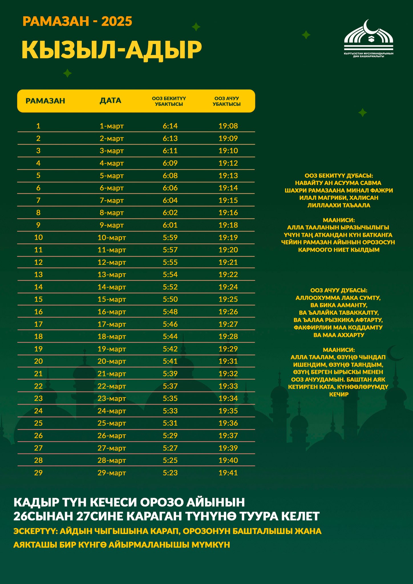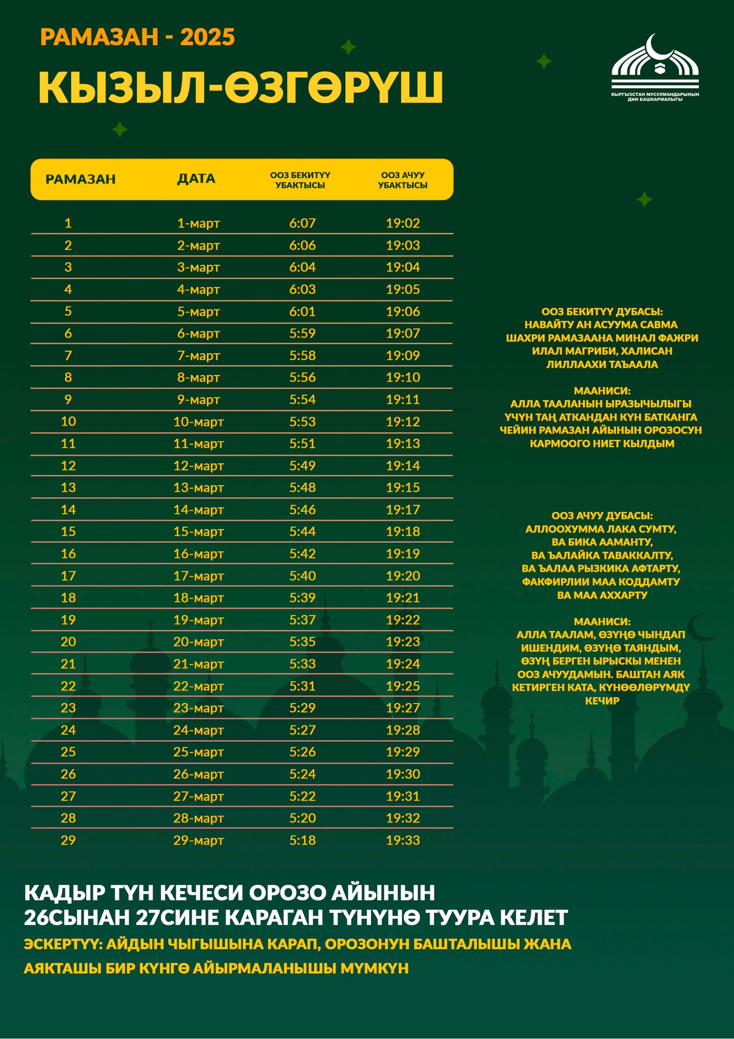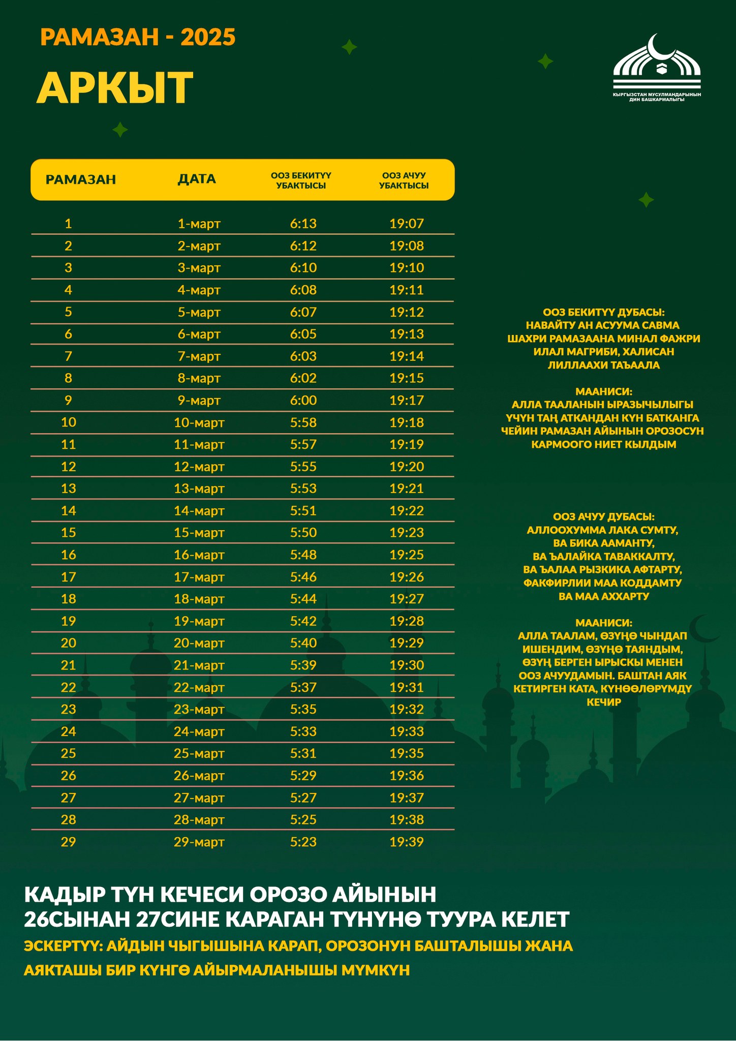 Быйыл Орозо айы 1-мартта башталат. Муфтият өлкөдө ооз ачуу жана ооз бекитүү убактыларын аймактарга бөлүп чыгарды. Бул Баткен, Ош, Жалал-Абад, Талас жана Нарын облустары боюнча ооз ачуу жана ооз бекитүү убактысы.