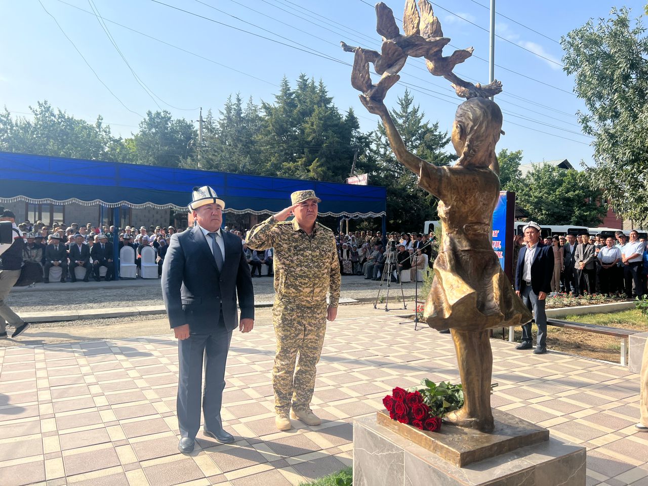 Абдикарим Алимбаев сөз сүйлөп: “Мекенди коргоп жатып, баатырларча курман болгон мекендештерибиздин элесин эстеп туруу — биздин инсандык милдетибиз. Биз дайыма алардын эрдигине баш ийип, таазим этебиз! Өз милдеттерин ак ниеттүүлүк менен аткарып жатып, шейит кеткен аскер кызматкерлеринин, катардагы жарандарыбыздын жакындарына терең кайгыруу менен көңүл айтам. Алар өзү үчүн өлгөн жок. Эли, жери, жакындары жана мекени үчүн жанын берди. Мындан өткөн баатырдык барбы? Бул — эр азаматтарыбыздын эрктүүлүк, тайманбастык сапаттарынын далили. Мына ушундай, чек арадан чегинбеген, Манас атанын урпактары турганда өлкө бүтүндүгү бекем сакталат деген ишеничим чоң”, — деди.