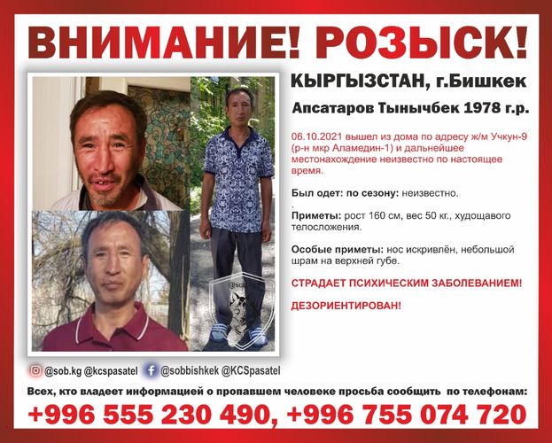 Бишкекте 43 жаштагы Тынычбек Апсатаров дайынсыз болуп жатат. Ал 6-октябрь күнү Учкун-9 жаңы конушундагы үйдөн чыгып кеткен бойдон ушул күнгө чейин кайрылып барган эмес.