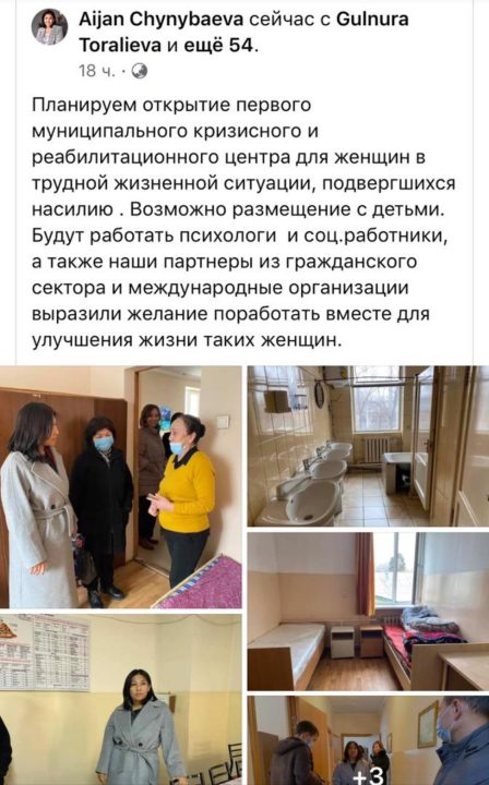 «Зордук-зомбулукка кабылган, турмуштук оор кырдаалда турган аялдар үчүн биринчи муниципалдык кризистик жана реабилитациялык борборду ачууну пландап жатабыз. Бул жерге балдар менен жайгашууга болот. Психологдор жана социалдык кызматкерлер иштешет. Ошондой эле жарандык сектордогу жана эл аралык уюмдардагы өнөктөштөрүбүз мындай аялдардын жашоосун жакшыртуу үчүн биргеликте иш алып баруу ниетин билдиришти», —деди Чыныбаева.