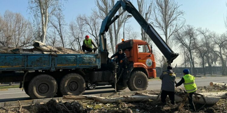 «Тамыры менен алынып, жүктөлүүдө. Жеринде 13 атайын техника жана «Бишкек жашыл курулуш» муниципалдык ишканасынын 20 кызматкери иштеп жатат. Бардык кыйылган бак-дарактар ишкананын базасына жеткирилет. Бүгүнкү күндө көптөгөн дарактардын сабагы чирип, зыянкечтерден жабыркап, оорунун белгилери байкалат. Көпчүлүк бак-дарактардын үстү куурап, жолдун четине да, аллеяга да эңкейиш болуп, жол кыймылынын бардык катышуучуларына коркунуч туудурат», — деп айтылат маалыматта.