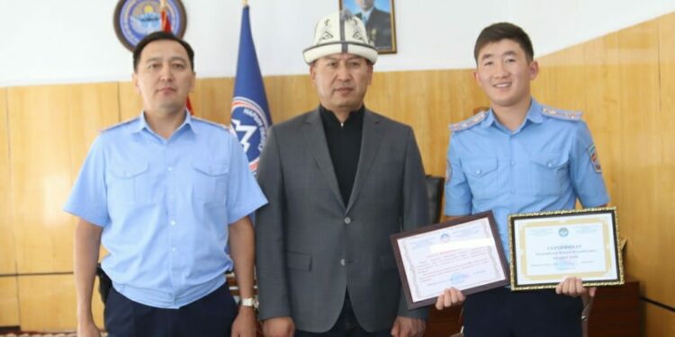 Нарын шаарынын Он-Арча базарында болуп өткөн окуяда адам өмүрүн сактап калган милиция кызматкерине Нарын облусунун жетекчилиги тарабынан сыйлык тапшырылды.