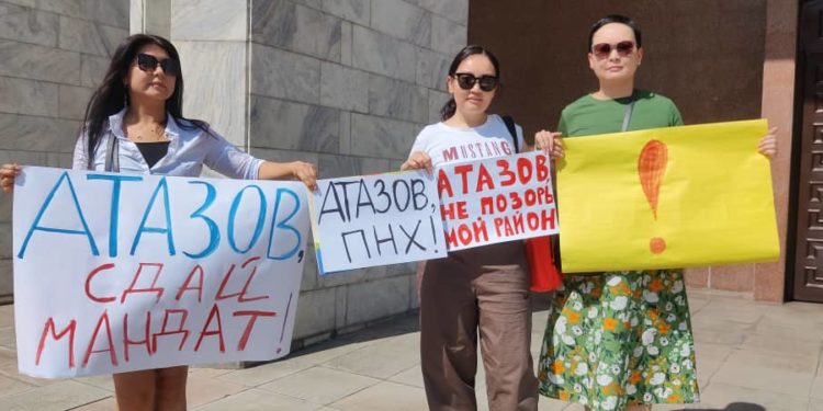 Депутат Шайлообек Атазовдун мандатын тапшырышын талап кылгандар Ак Үйдүн жанында акция өткөрүштү.