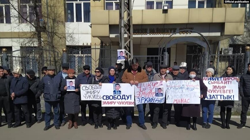 Бишкектеги Ленин райондук сотунун имаратынын алдында “Манас” аэропортунун башкармалыгынын мурдагы төрагасы Эмир Чукуевдин тарапташтарынын акциясы өтүп жатат. Алар анын негизсиз камалганын айтышып, аны абактан бошотууну, жок дегенде үй камагына чыгарууну талап кылышууда.