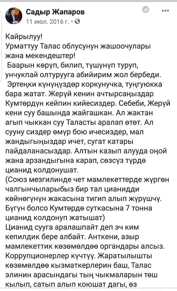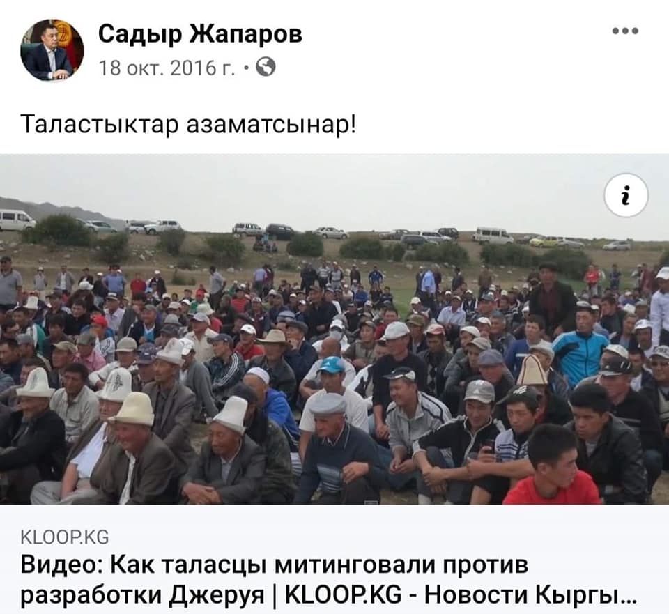 Соцтармактарга президент Садыр Жапаровдун 2016-жылы, бийликке келе элек кезинде Таластагы Жерүй кенин ачтырууга каршы болуп жазган билдирүүлөрү тарап жатат.