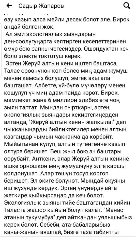 Анда саясатчы Талас облусунун жашоочуларына кайрылып, «Жерүйдү өз чөнтөк кызыкчылыктары үчүн «эч зыяны болбойт, ачабыз» деп чуркап жүргөндөрдүн жомокторуна эч качан ишенбөөгө» чакырат.