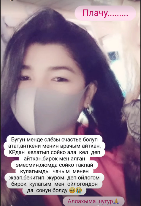 «Бүгүн мен бактылуу болгонумдан ыйлап жатам. Себеби, дарыгер «Кыргызстандан келе жатканда сөйкө ала кел» деген. Бирок мен алган эмесмин. Себеби, сөйкө такпай, кулагымды чачым менен жаап жүрөм деп ойлогом. Кулагым мен ойлогондон да сонун болду»,- деп жазды ал.