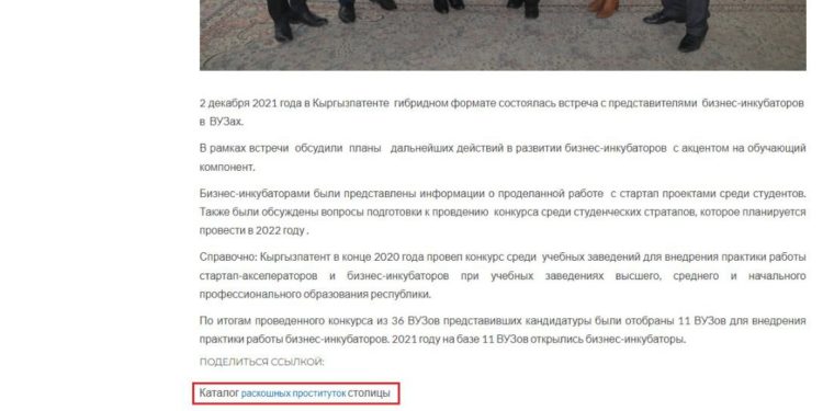 Анын айтымында, шилтеме интернеттеги ведомствонун расмий сайтында жайгаштырылган. «Кыргызпатенттин сайтында бизнес-инкубатор тууралуу маалымат жарыяланган жана анын астында «каталог роскошных проституток» деген шилтеме бар. Бул расмий сайт», — деди ал.
