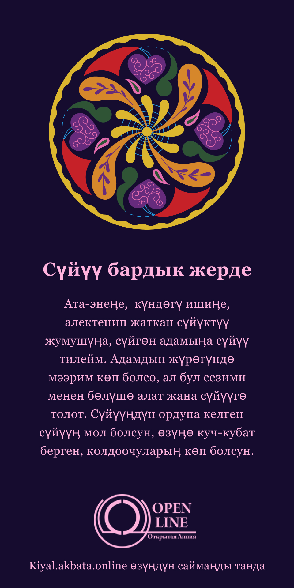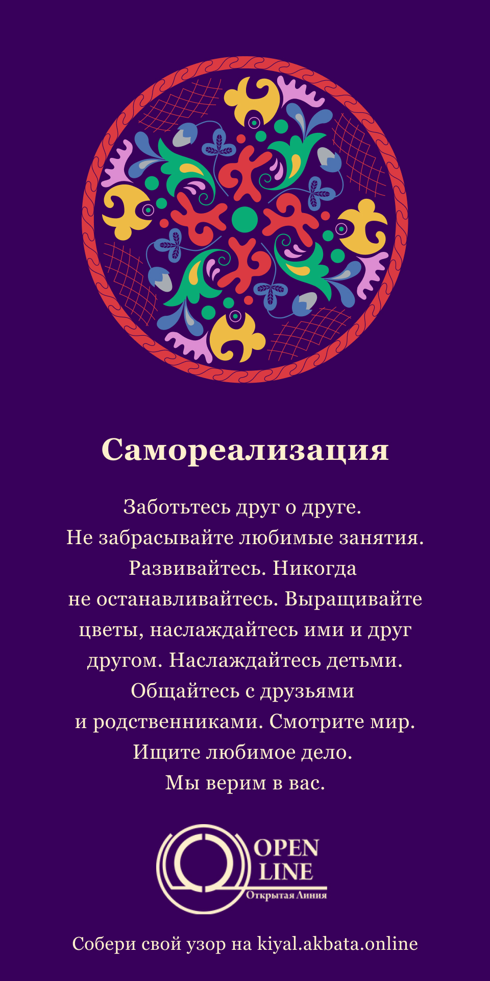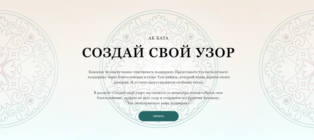 “Өзүңдүн саймалуу батаңды түз” – бул салттуу баалуулуктар, энелердин батасы, анын ичинде заманбап баталардын маанилүүлүгү, ар бир адам үчүн колдоо көрсөтүүнүн маанилүүлүгү тууралуу Кыргызстандагы биринчи оюн.