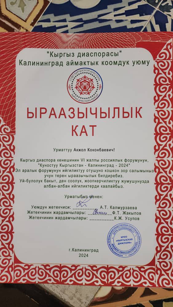 Калининград облусунун Гурьевск шаарында «Күнөстүү Кыргызстан-Калининград 2024» кыргыз диаспорасынын 6-жалпы орусиялык форуму болуп өттү. Форумга жергиликтүү бийлик, жергиликтүү ар улуттун диаспора башчылары жана ошондой эле жалпы Орусиянын региондорундагы диаспора башчылары катышышты.