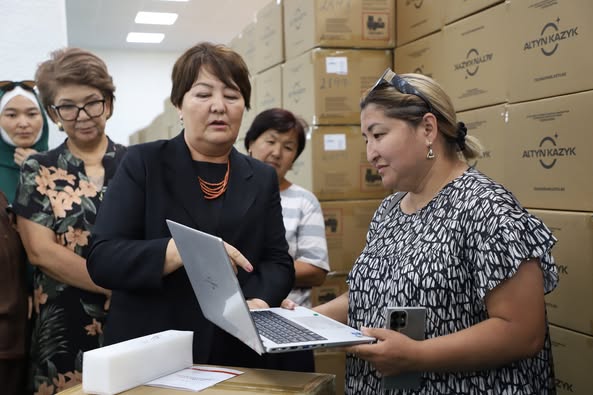 Бүгүн, 7-августта агартуу министри Догдуркүл Кендирбаева Кыргыз мамлекеттик техникалык университетинин алдындагы Технопаркта чогултулган “Алтын Казык” ноутбуктарын министрликтин аймактык бөлүмдөрүнө өткөрүп берүү иш-чарасына катышты.