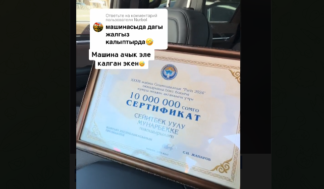 Мушкер кечээ спортчуларды сыйлоо аземинен кийин жаңы алган жол тандабасын бекитпей кетип калган. Жаңы машинасы Эски аянтта ичинде 10 миллион сомдук сертификаты менен ачык бойдон калган.