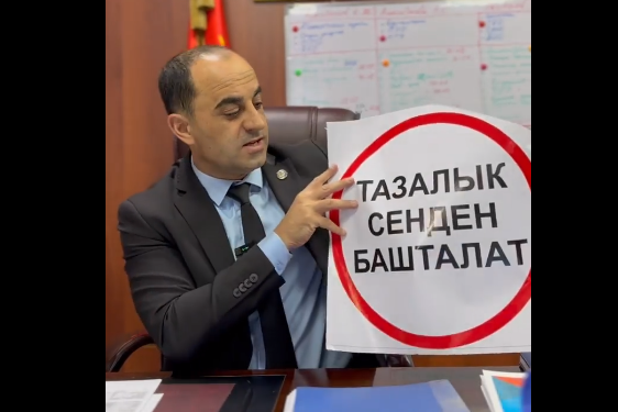 Ал ошондой эле «Тазалык сенден башталат» деген плакатты көрсөтүп, төлөбөгөн жарандардын тосмосуна ошону чаптаса кандай болорун сурады. «Сиздин ой-пикириңиз керек болуп жатат. Бир жылдан ашык төлөбөгөндөргө чаптасак туура болобу же болбойбу?» — деди ал.