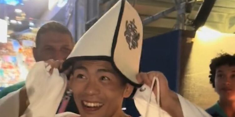 Сыйлоо аземи бүткөн соң, Олимпиада чемпиону болгон Кеничиро Фумитага кыргыздардын калпак кийгизген видеосу тарап жатат.