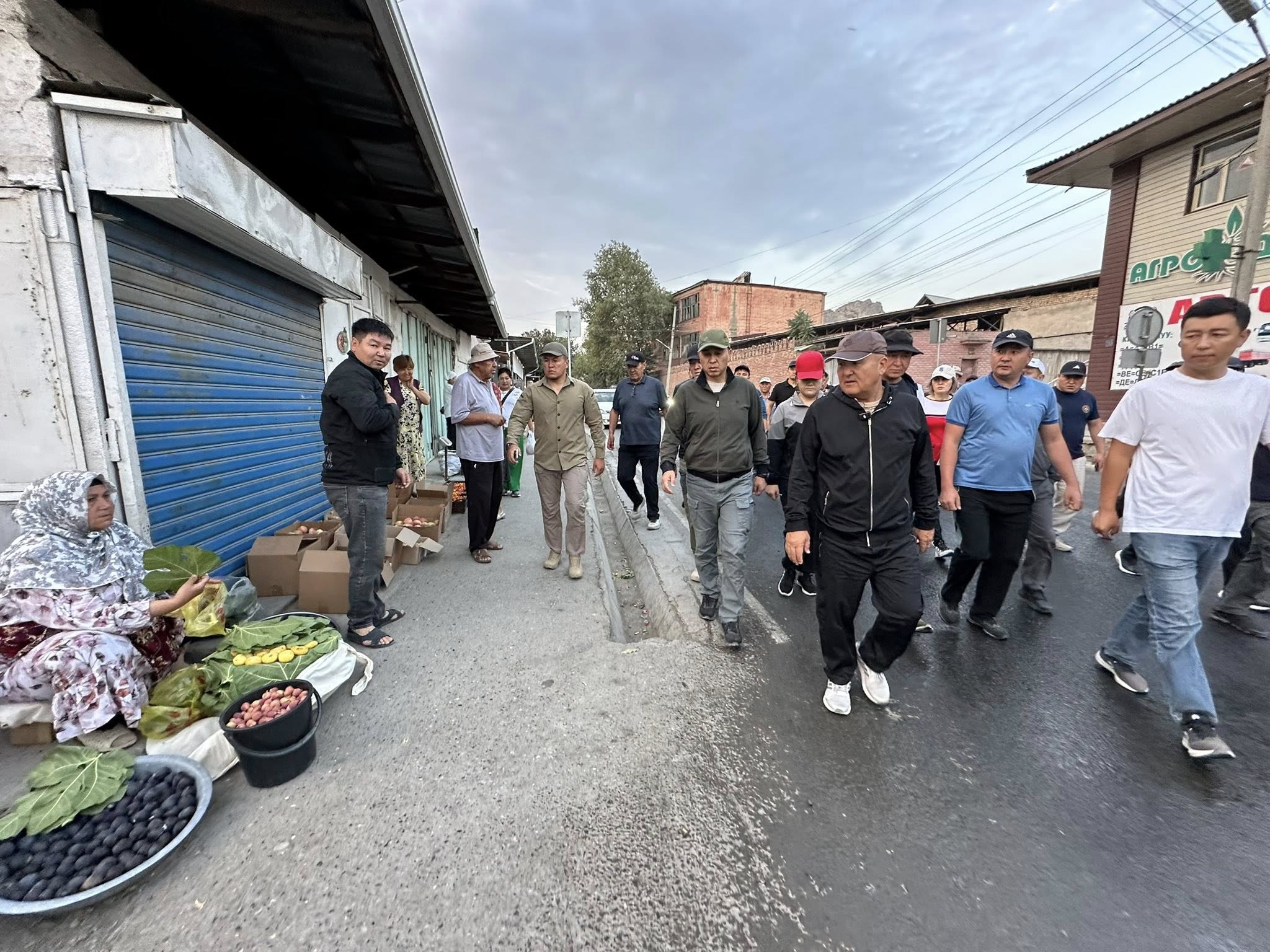 Ош шаарынын мэри Жеңишбек Токторбаев таңкы рейддик кыдыруунун алкагында “Тешик-Таш” базарынан Курманжан датка көчөсүнө чыккан кичи жолду кеңейтүү иштерин көрүп, мөмө-жемиш базарын жаңы базарга жылдыруу боюнча тапшырмаларды берди.