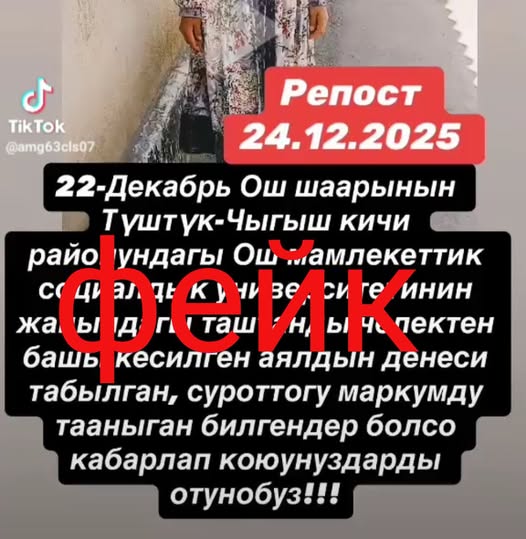 «Социалдык тармактарда төмөндөгү жалган маалымат тарап, жарандарды дүрбөлөңгө салууда. Ош шаарынын ички иштер башкармалыгы расмий түрдө билдирет: Мындай окуя Ош шаарында катталган эмес жана чындыкка таптакыр туура келбейт. Андыктан, бул маалыматка ишенбөөгө чакырабыз. Жалган маалымат тараткандар боюнча тиешелүү ыкчам иштер жүргүзүлө баштады», — дешти.
