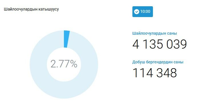 Саат 10:00гө карата жалпы шайлоочулардын 2,77 пайызы шайлоого катышты. Бул тууралуу БШК маалымдады.