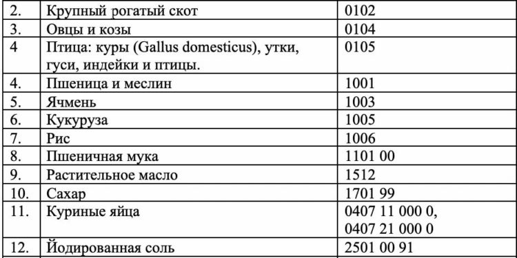 Тыюу салуу киргизилген азык-түзүлүктүн тизмеси: