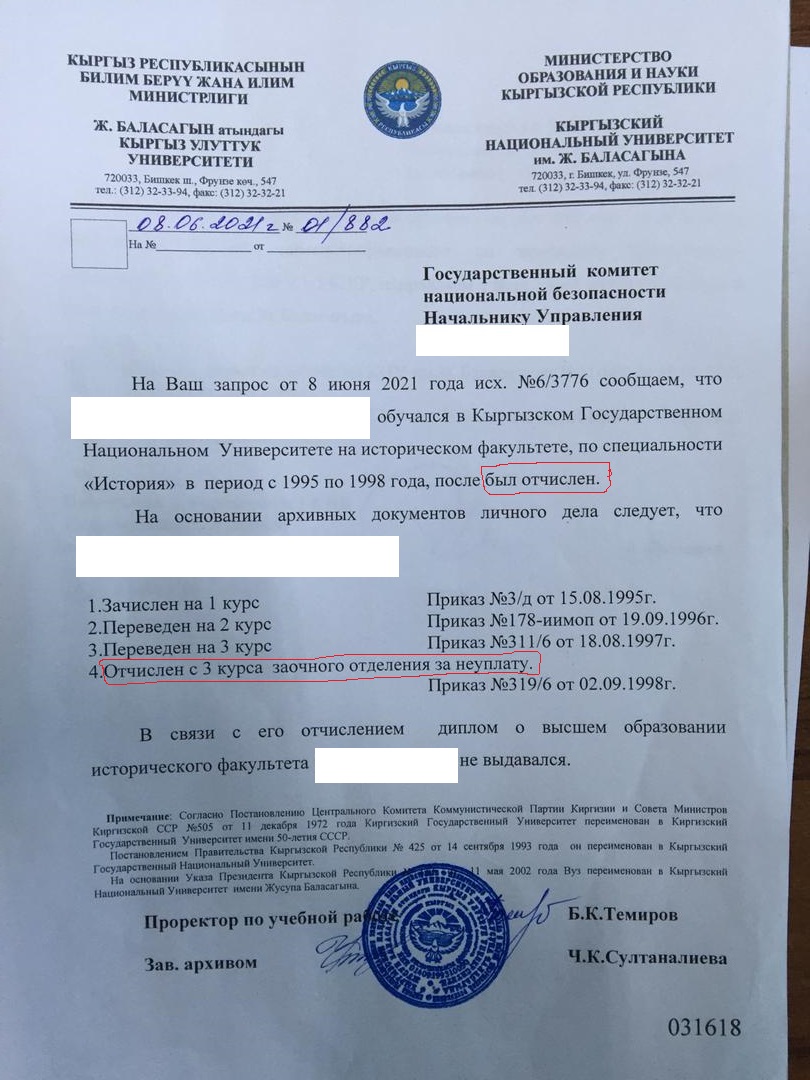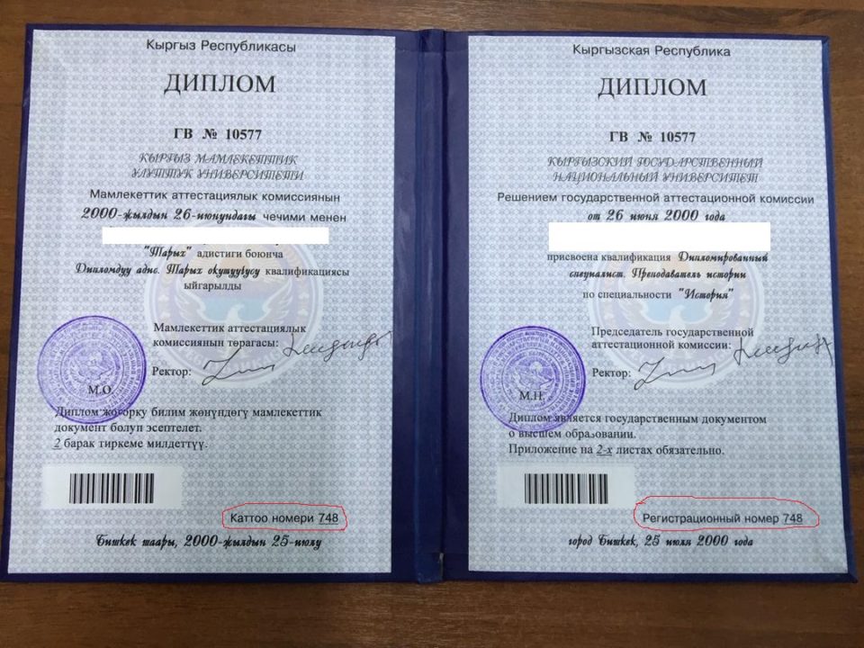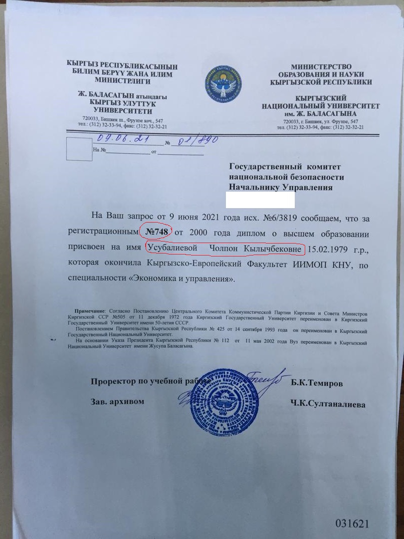 Жусуп Баласагын атындагы Кыргыз улуттук университетинен алынган жоопко ылайык, ал университеттин бүтүрүүчүлөрүнүн катарында жок болгон, көрсөтүлгөн номер менен катталган диплом башка жаранга берилген. Тергөө иштери жүрүп жатат.