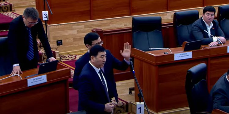 Депутат микрофону жок кыйкырып, сүйлөп жатты. Өмүрзаковдун жанына Медер Алиев келип, аны орундугуна алып кетти.