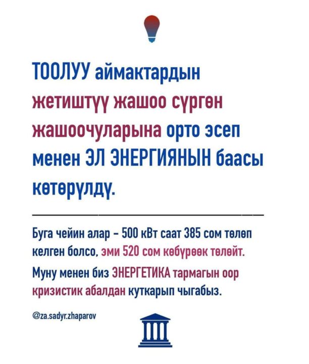 Дал ошол телеграм-каналга кечээ «Кыргызстандын бузукулары кимдер?», «Жашоо шарты жакшы үй-бүлөлөр үчүн электр энергиясы кымбаттады», «Эл бузарларга алданбаңыздар» деген маалыматтар жарыяланган болчу.