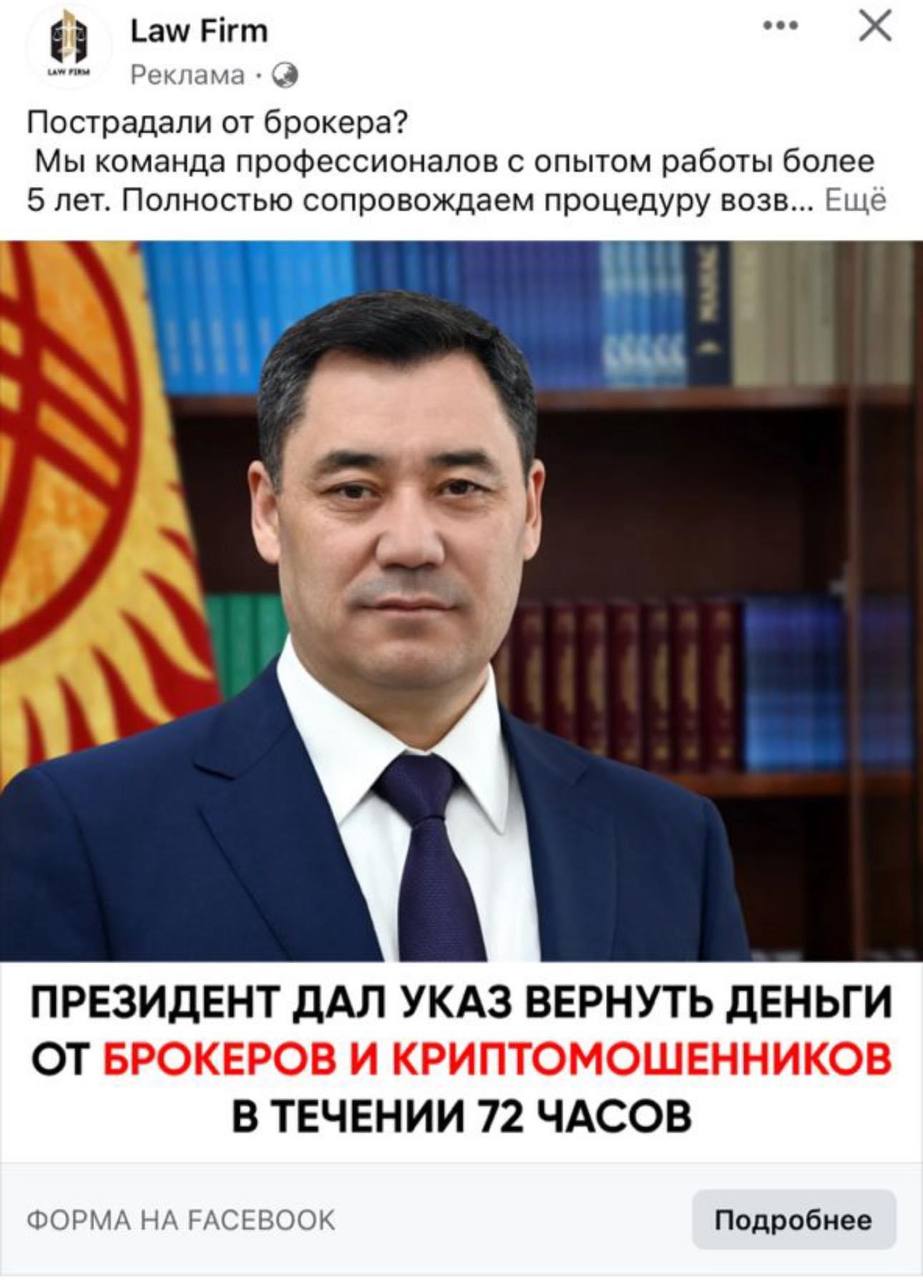 «Социалдык тармакта айрымдар президент Садыр Жапаровдун сүрөтүн колдонуу менен анын атынан брокер жана крипто көз боёмочуларга байланыштуу жарлыкка кол койгонун жазып, өздөрүнүн кызматтарын жарнамалоодо. Төмөнкү сүрөттөгү маалымат жалган экенин билдиребиз», — деп жазды ал.