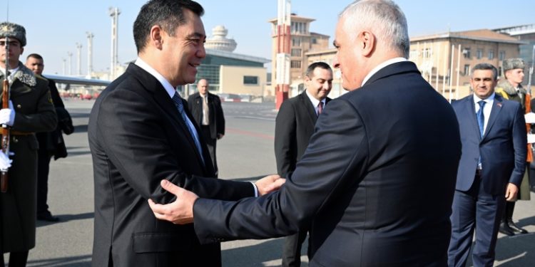 Садыр Жапаровду Армениянын вице-премьер-министри Мгер Григорян тосуп алды. Аэропорттун флагштокторуна Жамааттык коопсуздук келишими уюмуна (ЖККУ) мүчө-мамлекеттердин мамлекеттик желектери илинип, килем төшөлүп, ардак кароол тизилди.