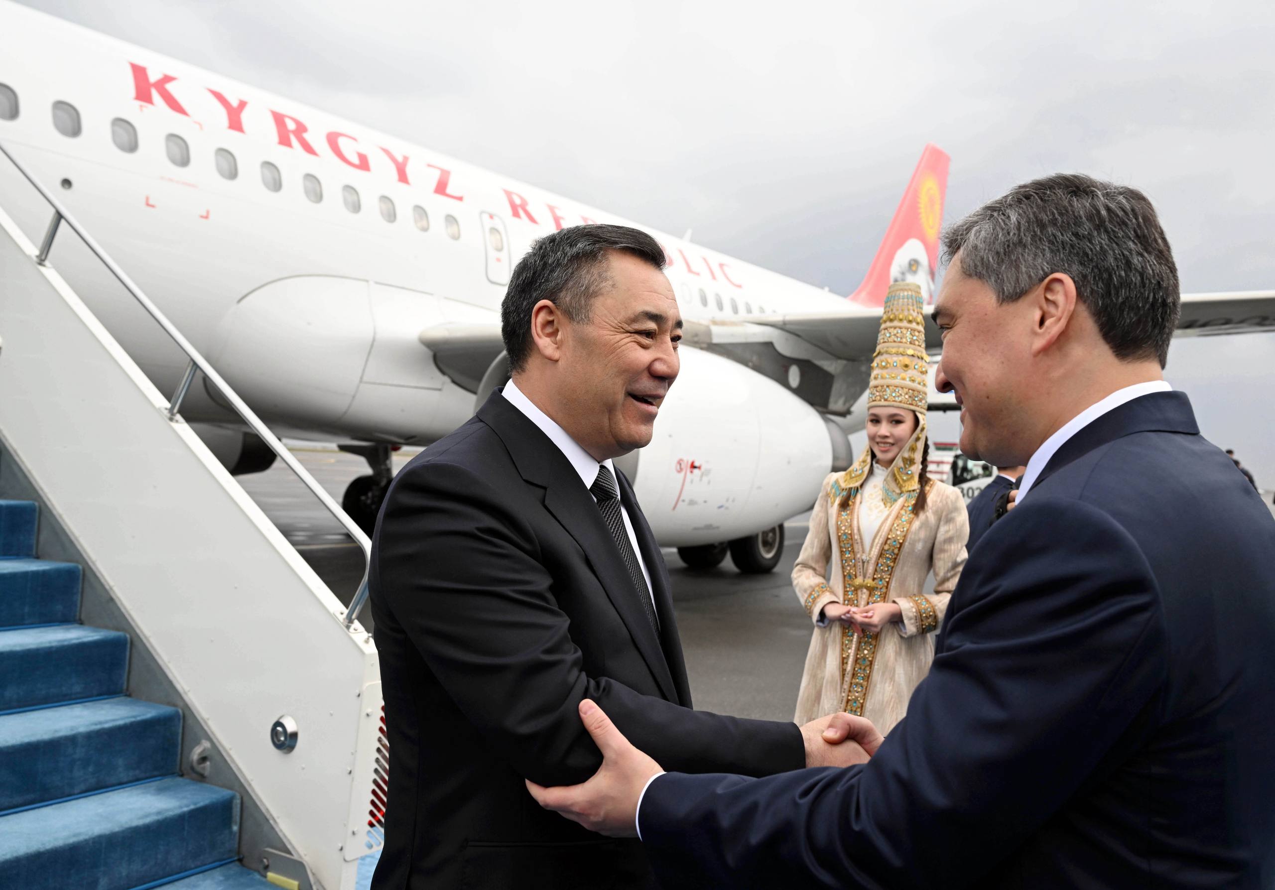 Президент Садыр Жапаровду Казакстан Республикасынын премьер-министри Олжас Бектенов тосуп алды. Аэропорттун флагштокторуна Регионалдык экологиялык саммитке (РЭС) катышуучу өлкөлөрдүн мамлекеттик туулары илинген, килем төшөлүп, ардак кароол тизилген.