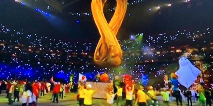 Буга чейинки Дүйнөлүк чемпиондуктун гимндери жаңырып, ошол турнирлердин тумарлары да, быйылкы жылдын талисаманы да чыгарылды. Андан соң BTS тобунун ырчысы Чонгук менен бирге Катар өлкөсүнүн ырчысы Фахад Аль-Кубаиси ырдап чыкты. Ырдан кийин Катар өлкөсүнүн тарыхы көрсөтүлдү. Катардын эмири сөз сүйлөп, чемпиондукту ачык деп жарыялады. Ачылыш азем фейерверк менен жыйынтыкталды.