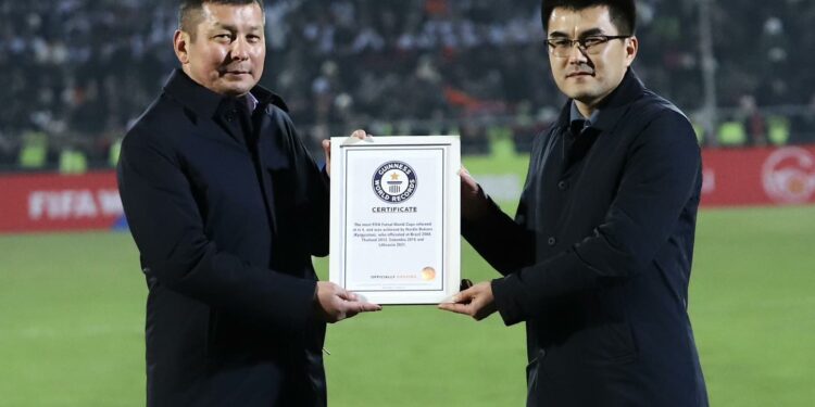 Кечээ, 21-ноябрда Кыргызстан-Оман беттешинин алдында футзал боюнча ФИФАнын экс-рефери Нурдин Букуевге Гиннесстин рекорддор китебинин сертификаты расмий тапшырылды.